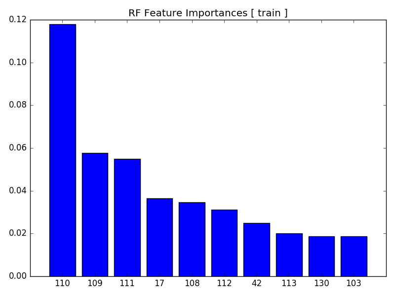 Of the top 10 features, we have 5 shared important features, although not in the same order or magnitude: 17, 42, 109, 110, and 130. Still, these bar charts of the relative importance of each feature bolster our confidence in the model.