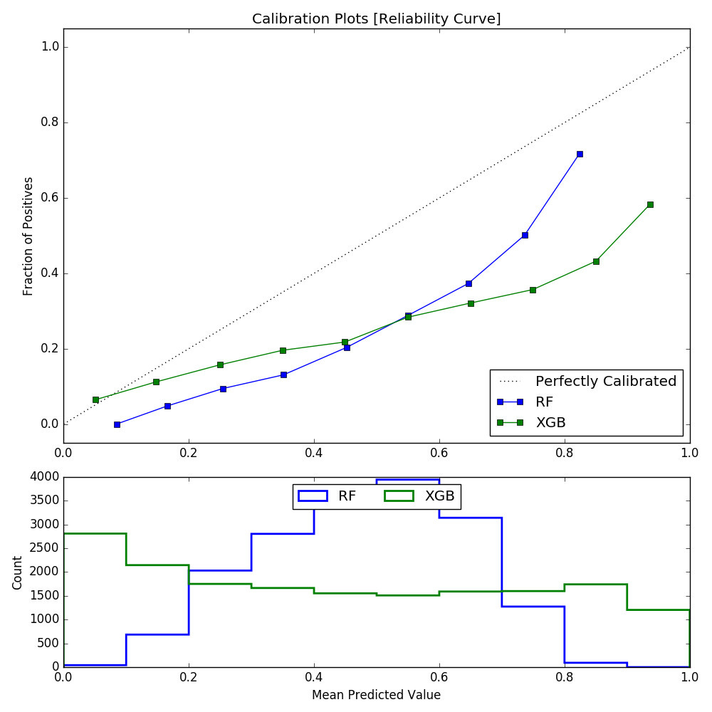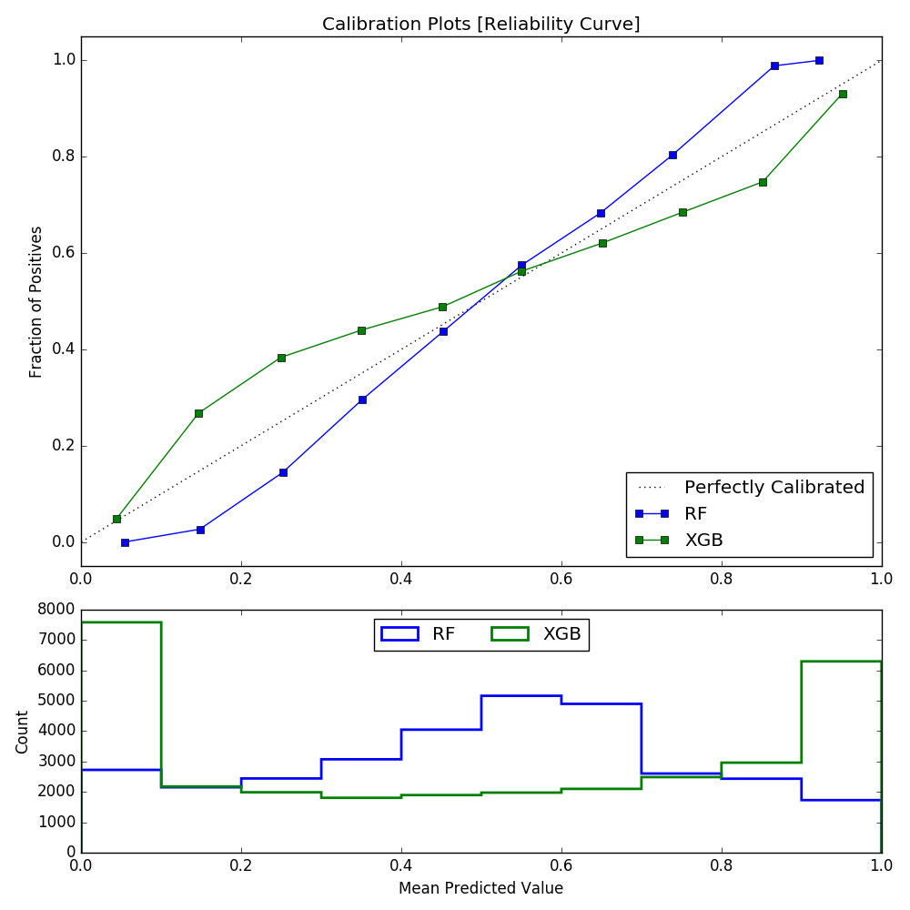 The perfectly calibrated classifier would yield a straight line, but we still see that even in the test case, the curves slope upward. So, which algorithm is best? The lower-right graph shows the distribution of the mean predicted value [deciles of 0.1] for RF and XGB. Clearly, the distribution of XGB counts (green line) is more uniform, so that gives us more confidence. In contrast, the RF decile counts are quite small at either tail. I prefer to use XGBoost in most cases, as its reputation is stellar, and it has won many Kaggle competitions.