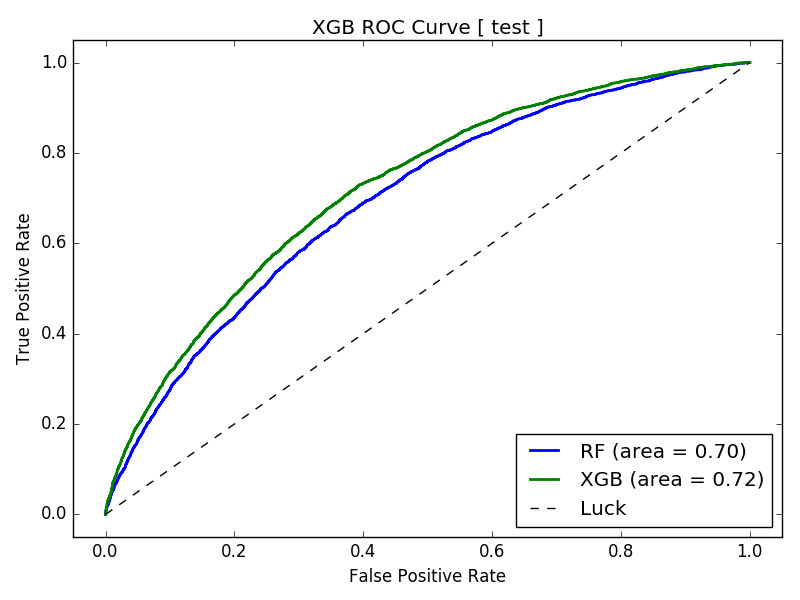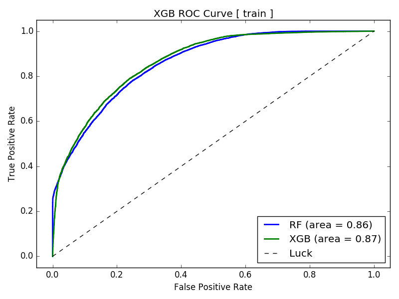 Before deploying any model in real-time, we want to assess the degradation in the model between the training and testing set. For classifiers, I prefer both the ROC (Receiver Operating Characteristic) and the calibration curves. First, here are the ROC curves: